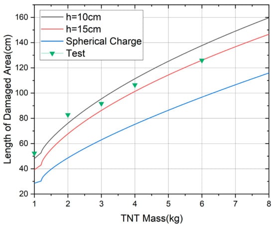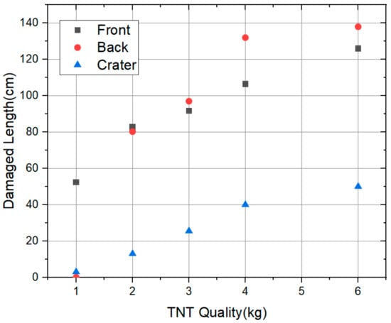 The TNT mass was increased to 10 kg and 12 kg for simulation, based on the experimental results. Scaled distance is commonly used to describe the similarity law of explosions; the damage of the beam does not take into account the impact of explosion height under contact explosion. Therefore, it is assumed that there is a nonlinear relationship between the damage length of the beam and the mass of the explosive.