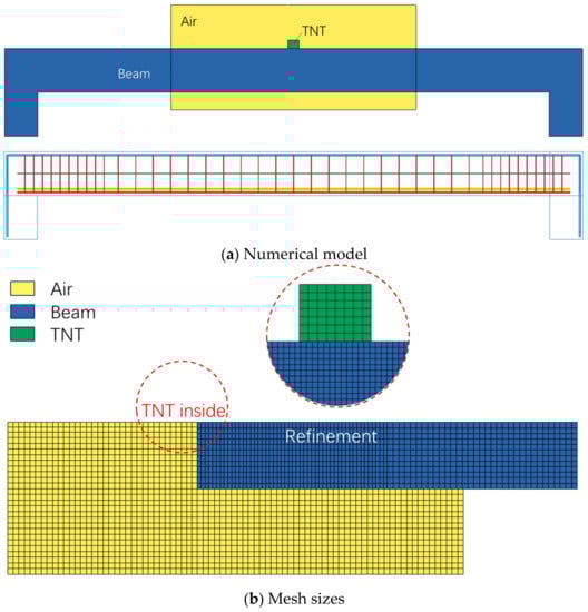 Euler elements were used to simulate air and TNT, and Lagrange elements were used to simulate concrete and steel. The interaction between the two elements is considered using the Arbitrary Lagrange Euler (ALE) method, which can simulate the interaction between detonation products and the beam. CONSTRUCTED_ LAGRANGE_ IN_ SOLID was used to define the fluid solid coupling of multiple material materials, which is widely used in numerical simulation studies for simulating explosions [25].