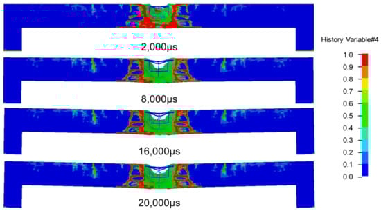 Figure 8 shows the numerical simulation under the condition of 4 kg, where the red area represents the damage area and cracks built into the RHT model. When calculating for 20,000 μs, the damage area basically does not change, so the calculation end time of the numerical simulation is 20,000 μs.