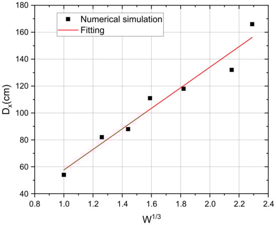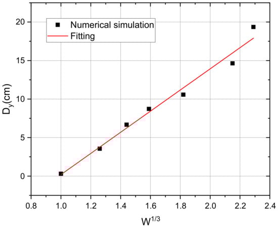 Thus, the relationship between the explosive mass and the explosion crater in the center of the beam under contact explosion is established. Assuming that the explosive height remains unchanged, the image is shown in Figure 21.