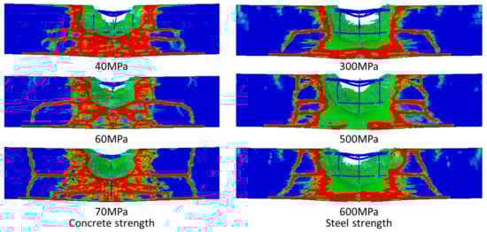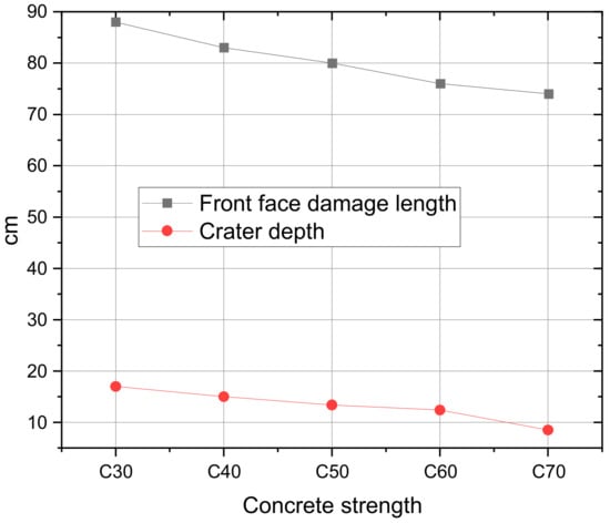 The concrete strength of reference beam (30 MPa) was varied to 40, 50, 60, and 70 MPa and the steel strength of reference beam (400 MPa) was varied to 300, 500, and 600 MPa. Then, the impact of the strength of concrete and steel on the beam damage was investigated. Table 5 summarizes the material parameters of different strength concretes in numerical simulation. The parameters of the steel are only modified for tensile strength and compressive strength. The simulation results of the beam under different concrete and steel strengths are shown in Figure 12. The depth of the crater and the length of the front damage zone are shown in Figure 13.