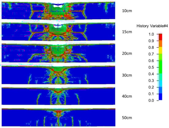 The explosive contacted the surface of the reinforced concrete beam in the tests, while for near-field explosions the stand-off distance had a significant impact on the load acting on the surface of the reinforced concrete beam. The stand-off distance is the vertical distance from the center of the explosive to the surface of the beam. In numerical simulation, the TNT mass is maintained at 3 kg, the stand-off distance is changed, and the corresponding proportional distance is calculated. The different stand-off distance cases are shown in Table 6 and the simulation results are shown in Figure 14. According to the numerical simulation results, it can be found that the damage to the beam decreases rapidly with the increase of stand-off distance. The crater is significantly reduced compared to contact explosion when the stand-off distance is 10 cm; there is no obvious crater, and the side collapse decreases and cracks increase, when the stand-off distance is 20 cm; only the concrete protective layer on the beam surface is damaged when the stand-off distance is 30 cm and the scaled distance is 0.208 m·kg−1/3; only the concrete on the front side of the beam showed slight damage and there were no obvious cracks on the side when the stand-off distance increased to 50 cm. The degree of damage to the beam caused by TNT contact explosions of the same mass increases sharply compared to near-field explosions. The damage to the beam will be significantly reduced when the scaled distance is 0.208 m·kg−1/3.