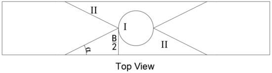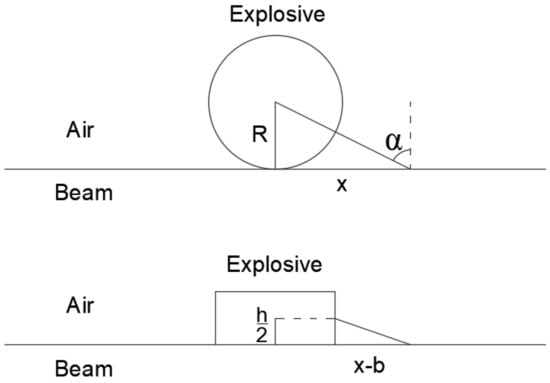 The majority of crushing and spall actions of concrete are often based on the concrete slab. The surface action load is equivalent to the slab to calculate the load distribution in the span direction due to the large difference in size in the span and width direction of beam members, and the typically significant damage in the width direction. Figure 15 presents the calculation model of the surface impulse of rectangular explosives under contact explosion. Assuming that the explosive detonates instantaneously, the square charge comes into contact with the concrete surface, the detonation products impact the concrete at a high speed, nearly circular crushing area craters are observed on the upper surface, and the surface impulse effect is calculated on the upper surface of the beam.