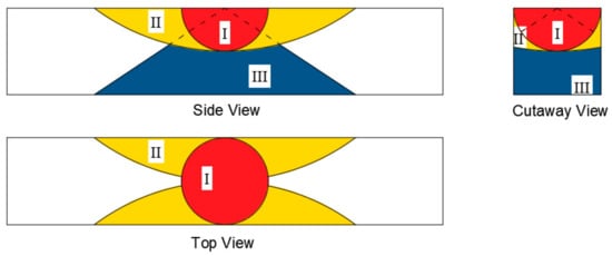 The initial crushing damage range of concrete acting on the surface can be simply inferred according to the compressive strength of concrete. Tensile and compressive strength values increase with the increase of strain rate, the peak strain in tension remains unchanged, the peak strain of compression decreases with the increase of strain rate, and the maximum volumetric strain increases with the increase in strain rate due to the strain rate effect of concrete. Therefore, the strain rate effect caused by compression in the vertical direction reduces the damage in this direction, and the depth of the failure area measured in the test is smaller than that in the beam span direction. The traditional method of dividing the damage area often equates the beam with the plate, which is divided into the crushing area close to the explosion source at the front and the spalling damaged area of the tensile wave reflected on the back. Damage on both sides of the beam width direction is significant in the actual test process. The side spalling area is introduced to refine the concrete loss of the beam, as shown in Figure 17.