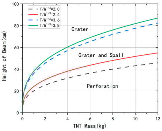 The above equations are curve fitted, and the mass of the TNT coordinate unit is changed to the unit kg to obtain the relationship between the beam height and the explosive mass in the case of spall and penetration under beam contact explosion, as shown in Figure 20.