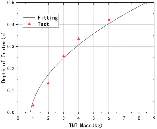 The crater of explosion crater depth is ideal when the mass of TNT is 1–6 kg. The error is large when the mass of TNT is 2 kg because the occurrence of the mid-span displacement of the beam increases the local loss of the beam and the large value of the explosion crater during measurement in the actual test process after the mass of TNT increases from 2 kg to 3 kg. This process is ignored in the fitting curve. The explosion crater depth increases nonlinearly with the increase in the mass of TNT, and the increase in explosion crater depth gradually slows down. In addition, the height of explosives in the fitting curve remains unchanged. The small or large mass of explosives may be inconsistent with the actual situation, and the height must be adjusted, although the overall change trend remains unchanged.