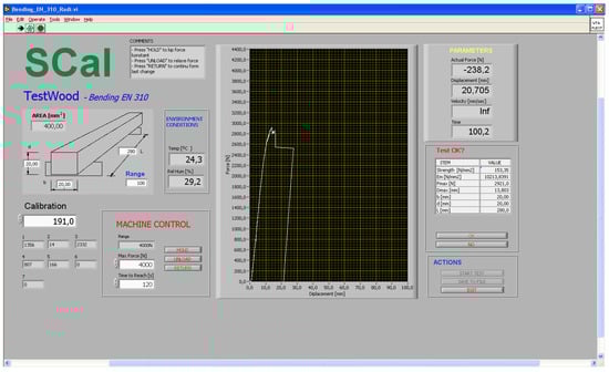 The process of calibrating the method of applying stress sound waves should therefore be performed by directing the sound waves at right angles, analogous to the direction of static pressure forces on standard laboratory test tubes, in the longitudinal, radial, and tangential direction of the flow of mechanical fibers and compare the bending resistance values obtained by calculation [] and by applying mechanical compression force. In this phase of the test, it was necessary to make a certain modification of the calibration procedure, because the application of stress sound waves on small test tubes for mechanical tests, as was done with X-ray and ultrasound waves in preliminary research, was not technically feasible.