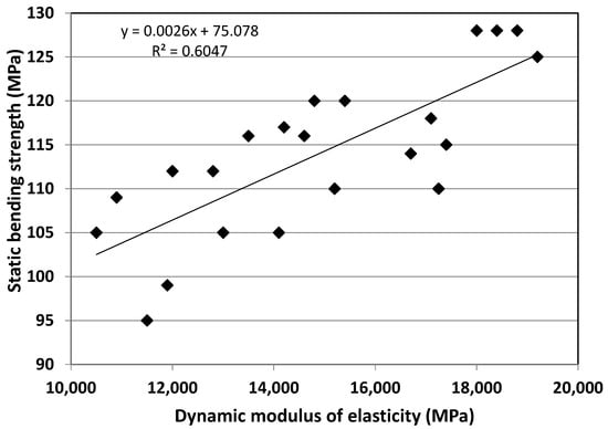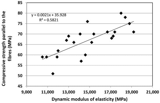 To assess the predictive potential of the stress-sound method, the dynamic flexural modulus was used (Figure 3, Table 3) as a significant indicator of the acoustic property of wood, which is calculated according to the formula based on the speed of propagation of the stress-sound wave [] (p. 100) (Table 4 and Table 5). By correlating it with the parameters of static compressive strength and static bending strength (Figure 4 and Figure 5), correlation coefficients r-76 and r-77 were obtained, which, given that wood is an anisotropic material, can be considered very good. As the speed of sound, when it comes to wood, is not strongly dependent on the density: