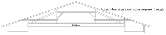 The approach used in this research for the in situ assessment of the structural performance of a timber structure is based on the standard allowable loads given according to the type and quality of wood (SRPS EN 1995-1-1) []. For modern truss wooden roof structures, the values defined by the Eurocode (EN 1991) [] were used, calculated based on the weight of the loadbearing element and all the wooden elements of the supporting assembly.