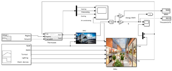 The shopping mall subsystem models collect the thermal behaviour of the building. The inputs of the shopping center are the thermal loads previously calculated, the thermal power of the air conditioning system in the various regimes, and the external temperature. As the output, the subsystem generates the temperature of the TCC of the commercial building. It is necessary to unify the three transmittances of the walls in a Hequivalent transmittance obtained from the weighted average. The thermal loads and thermal power of the system add up to obtain the resulting power level. Finally, the power capacity of the shopping mall is calculated as follows (Equation (8)):
