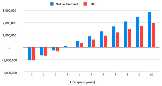 During the maintenance phase, an inspection of the appliances was foreseen to replace any non-functioning lamps. The life span of LED lamps installed in the mall is over 60,000 h. In five years (about 25,000 working hours), only 3% of the lamps need to be replaced. Therefore, every five years, the maintenance of the lighting system requires an estimated cost of EUR 25,000. The payback time was approximately three years, in line with the economic needs of the mall. The NPV, ten years after the investment initial, is worth approximately 2 millions of €, this means that, ten years after the initial investment, the relamping produced a profit of more than two million euros, equal to 184% of the investment (Figure 3).
