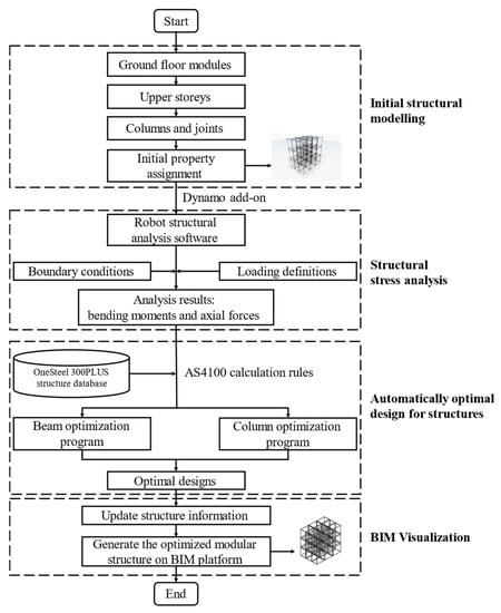 Future research on automatic design optimization for MC integrated into BIM will focus on the refinement and feasibility extension of the developed method, including the following: (a) more structural elements can be added to the automated design program to enrich the target projects; new modeling blocks should be defined to match diverse modular structures; (b) it is recommended to consider more complex loading situations; test models, such as wind and seismic tests, can be included by adding modifying instructions; (c) the structure database can be expanded to include more sections, which would be beneficial for the design optimization; (d) other software can be made compatible with the method by developing effective data transformation tools. The workflow of the proposed method could also be made more compliant with the definition of smart engineering by blending computing methods like machine learning and metaheuristic searching to innovate processes of optimization, decision-making, and collaboration.