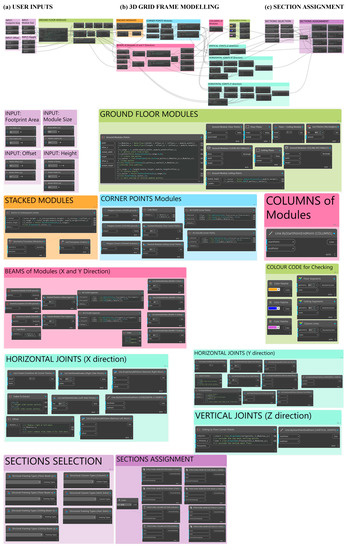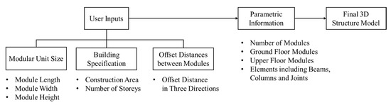 The main features of creating the 3D grid frame model are given in Figure 3, which contains all the necessary inputs for the digital modeling in Dynamo. The standard size of each module is decided before modeling, including its length, width, and height. The construction area and number of stories are also important for determining the layout of floors and their distribution in the vertical direction. Offsets represent distances between modules in three directions. The detailed modeling procedure is explained below.