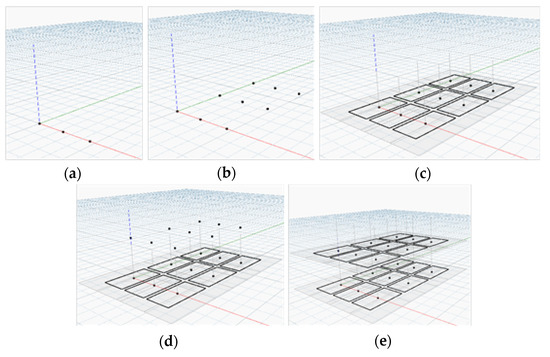 Firstly, the center point of each module in the first row along the x-axis is input (Figure 4a). This procedure is repeated for each row (Figure 4b). The perimeters are formed around the center points based on the modules’ dimensions (Figure 4c). The center points of the modules’ ceilings are added by copying the center points of the floors and elevating them by the modules’ height (Figure 4d). The perimeters of the ceilings are formed in the same way as for the floors (Figure 4e).