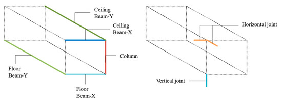 To create a real structural model in the BIM platform, all the grid lines must be assigned the properties of valid steel components. Based on the identical modules assumed in this prototype, each modular unit has similar beam and column sections. Beams spanning the x and y directions may have different sections of different lengths. Variations in beam sections between floor and ceiling beams may also be possible due to different loading conditions. Therefore, all horizontal joints in both the x and y directions are assumed to have the same section length, in contrast to vertical joints, whose section length is identical to that of the column. These assumptions thus lead to six variations of structural members, to which different sections can be assigned (Figure 9).