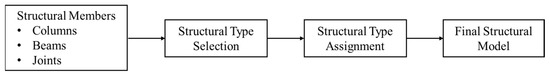 There are three main steps involved in structural member section assignment, as shown in Figure 10. Firstly, all line segments must be grouped in terms of structure types such as columns, beams, and joints. Various initial steel members from the Australian Engineering Database OneSteel 300PLUS [50] are then selected and assigned to corresponding structural members.
