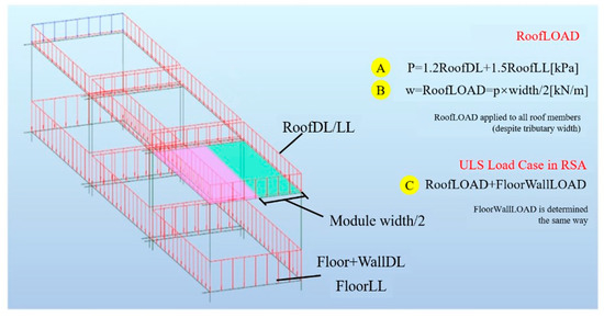 The “load case” in RSA is a grouping for the load definitions, and thus a load case of “ULS” is just an arbitrary name without considering loading factors. Therefore, different kinds of loads are combined by factors before being defined in RSA. Figure 11 summarizes the processing of load inputs using a ULS combination of 1.2 G + 1.5 Q, where G is the sum of dead loading and the structure’s self-weight, and Q represents the live loading. The RoofLOAD is the ULS multiplying half of the width, as indicated by purple and green on the roof in Figure 11.