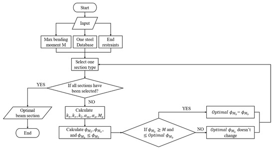Figure 12 is the flow chart depicting the whole optimization procedure for beam structures, which is a loop of walking through the entire steel structure database. After all necessary data are inputted, one specific beam is selected, and factors including are calculated based on the manner of loading and structural restraints. The reduction factors and are calculated using Equations (3) and (5), while is defined by Equation (4), where are the yield strength and section area of the selected beam, respectively. is the geometry factor based on the dimension information obtained from the database. The effective bending strength of the selected section is compared with that of the current optimal section (Equations (6) and (7)) to decide if the optimal beam section needs to be updated. The loop continues until the last option in the database is selected.