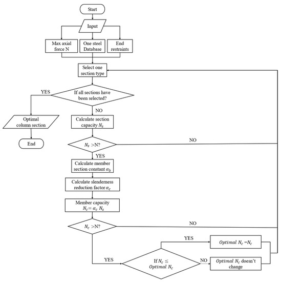 Another structural design optimization is for columns, as shown in Figure 13. Similarly, column properties, including form factor (), cross-sectional area (), and yield strength (), are extracted from the Australia OneSteel 300PLUS database. A calculation loop is needed to identify the best column section. Once a column type is selected, its section capacity is determined by Equation (8) according to the Australian AS4100 standard [51] to make a preliminary capacity assessment against the given maximum axial force N.