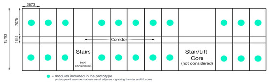 The study model is based on a modular hotel project, modules of which are delivered whole as shipping containers and fully prefabricated to be ready to install onsite. After analyzing the project information, the model was represented in the prototype as a four storey 2 × 11 grid of adjacent modules. It was noticed that the corridor sections were secondary structural elements but were deemed necessary for their potential to influence load distributions. Therefore, the corridors were added to the prototype for the comparison study, using the element list to define the start and end points of the corridor within the structure. To do so, the idea of modifiers was proposed to shape the prototype into more realistic building configurations, in which the geometry data could be extracted in such a way that it could affect specific areas or the entire model. Suggestions for modifiers might include the following capabilities: