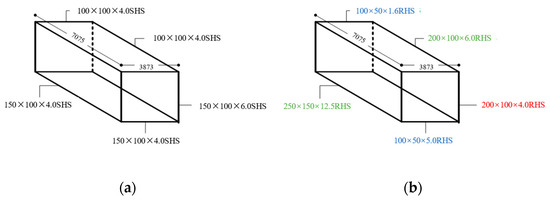 While Figure 16a shows the established grid frame for the study project from isometric and front views, initial sections assigned to different structural elements are based on the final design from the industry supplier, as shown in Figure 16b; for example, the column section is 150 × 100 × 6 RHS.