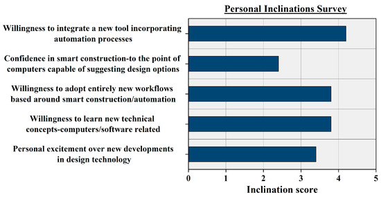 A personal inclination survey was also carried out, as shown in Figure 19, in which the score ranged from 0 to 5. The survey reveals that the interviewed staff were well inclined to adopt new tools and processes but not as keen when it came to an entirely new workflow. This may be a small indication of the barrier of negative attitudes toward change, but it could be traced to the barrier of a lack of adequate tools to support specific applications. With the proposed BIM-integrated design program, the user does not need to have specialist knowledge of software, as it has an intuitive interface and the design inputs that engineers often already consider in the realm of steel design. There would be less apprehension due to the costs associated with training, and the ease of use, combined with impressive capability, would hopefully make users more inclined to change.