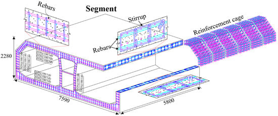 The standard element length of an immersed tunnel is 180 m, which consists of 8 segments, each with a length of 22.5 m. These segments are connected through waterproof joints to form an element. Due to the width of the immersed tunnel section being 37.95 m and the height being 11.4 m, full-scale fire tests are difficult to conduct. Therefore, a reduced-scale model of the standard segment was built, following the reduced-scale tests of the immersed tunnel’s shear keys [,]. The scale factor of 1:5 was used, which was based on the limitations of the test site, loading equipment, and heating system. The prototype and reduced-scale model of the immersed tunnel are shown in Figure 1. The dimensions of the reduced-scale model were 5.8 m in length, 7.59 m in width, and 2.28 m in height. Except for the midwall (160 mm), the thickness of all other components of the immersed tunnel was 300 mm. For detailed information on the similarity coefficients of models, please refer to previous work []. The structure and rebar forms of the immersed tunnel are illustrated in Figure 2. The same materials (C50 and HRB400) as the prototype were used to build the reduced-scale model. The granite gravel used in this study had a continuous gradation, with particle sizes ranging from 5 to 20 mm (with a mass ratio of 3:7 between particles of 5–10 mm and 10–20 mm), as shown in Table 1. Before the fire test was carried out, no pre-existing shrinkage cracks were detected on the surface of the immersed tunnel.