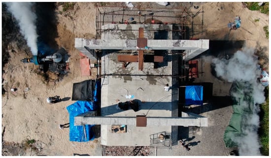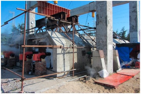 The heating system utilized diesel as fuel, and flame was sprayed by burners to provide heat in the immersed tunnel. The fire test furnace was designed based on the heat balance method []. According to the principle of energy conservation, the fire test furnace was in thermal equilibrium, where the heat generated by diesel combustion was equal to the sum of the heat absorbed by the immersed tunnel and the heat taken away by the high-temperature smoke discharged from the furnace. To create a closed space within the immersed tunnel, walls were constructed at both ends of the tunnel. Four flues were built at the bottom of the tunnel to enable the high-temperature smoke to enter the flues through the vents on the floor of the tunnel. The high-temperature smoke could not be discharged directly through the induced draft fan. Before entering the fan, the smoke was cooled by the water spray cooling system and filtered to prevent environmental pollution. The fire test furnace is illustrated in Figure 3, while the fire test scene of the immersed tunnel is depicted in Figure 4.