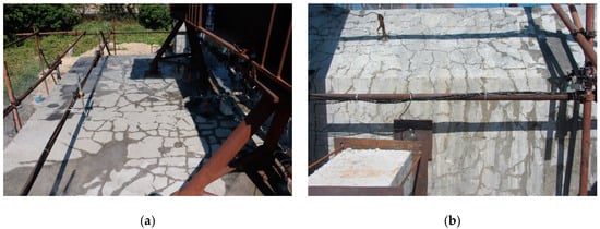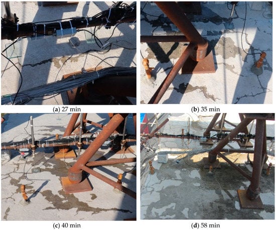 Throughout the fire test, infrared thermography was utilized to record the temperature of the outer surface of the tunnel ceiling. As the fire progressed, water and vapor emanated from concrete cracks and covered the concrete surface. As a result, the focus of the infrared thermography observations shifted from the concrete surface to the water, which overflowed from the cracks and progressively covered the outer surface of the ceiling. Therefore, the parameters of the infrared thermography needed to be adjusted, specifically the emissivity of water and concrete, which is the parameter related to the measured object. In the present study, the emissivity in the infrared thermography was adjusted when the crack of the ceiling was filled with water, as the cracking of submerged tunnels during fire was primary research object. Figure 5 illustrates the cracks and water on the ceiling. At 35 min, most of the cracks on the ceiling were filled with water, and the emissivity of concrete (0.94) in infrared thermography was adjusted to the emissivity of water (0.957) at that moment. At 50 min, most areas of the ceiling surface had been covered by water.