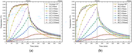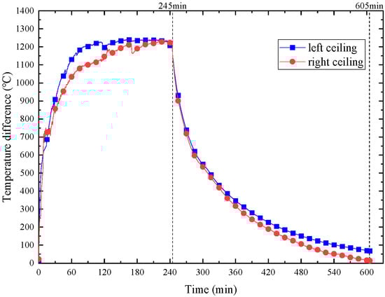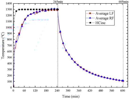 Following the application of the mechanical loads on the immersed tunnel, the loads were maintained for 12 h to ensure that the deformation and settlement of the tunnel were stabilized. Subsequently, the fire test was conducted on both tubes of the tunnel, while the mechanical loads were sustained throughout the test. The fire test comprised two phases, namely heating and cooling, with the former lasting 245 min and the latter 360 min. The temperature curve of the fire test furnace is depicted in Figure 6. At the early stage of the fire test, the furnace temperature rise rate was lower than the HCinc curve, owing to the high moisture content in the concrete, which led to the evaporation of the moisture, thereby absorbing a significant amount of heat. Furthermore, the burners could not achieve maximum power due to the insufficient combustion of diesel, which also contributed to the low furnace temperature rise rate. As the temperature heightened, the moisture within the concrete began to evanesce, thereby augmenting the thermal efficiency of the burners. Subsequently, in the later stage of the fire test, the furnace temperature approached the HCinc curve and ultimately attained a temperature of 1300 °C.