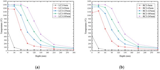 Variations of concrete temperature along depth inside the ceiling. (a) Ceiling of left tube. (b) Ceiling of right tube.