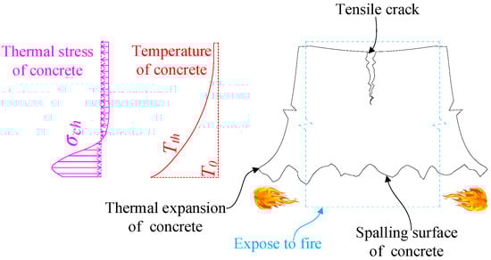 The large temperature gradient between the inner and outer surfaces of the ceiling indicated the challenge of coordinating thermal strain within the ceiling. Specifically, the inner surface experienced high temperatures and significant thermal strain, while the outer surface remained cool and underwent minimal thermal strain. The thermal expansion of the inner surface was limited by the outer concrete, leading to compression of the former and tension in the latter. When the temperature difference between the internal and external surfaces of the immersed tunnel crossed a certain threshold, the external surface received tensile stress that exceeded the ultimate tensile strength of the concrete, instigating the formation of cracks. The depiction of the mechanism explaining concrete cracking due to uncoordinated thermal strain is presented in Figure 10.
