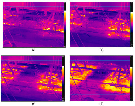 Infrared images of the ceiling during the fire test. (a) At 100 min, the infrared image of ceiling. (b) At 120 min, the infrared image of ceiling. (c) At 140 min, the infrared image of ceiling. (d) At 245 min, the infrared image of ceiling.