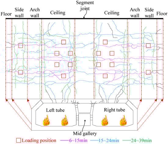During the fire test, the maximum deformation of the tunnel was found to be merely 14.5 mm after 245 min of heating. Notably, the deformation direction of the tunnel was observed to be opposite to that of the mechanical loads. These results suggest that the bearing capacity of the immersed tunnel under fire was adequate, further avoiding significant deformation due to the intense heat. However, despite the structural integrity of the tunnel, the outer surface still exhibited severe cracking during the fire test (Figure 11). As previously analyzed, uncoordinated thermal strain primarily caused this effect, leading to severe cracking of the immersed tunnel even with sufficient bearing capacity. Notably, the structural characteristics of the immersed tunnel render it susceptible to tensile cracking induced by thermal expansion inside the tunnel under fire. As these tunnels are frequently located deep beneath the ocean, severe concrete cracking may result in seawater seepage into the tunnel, triggering a catastrophic disaster. Therefore, even when the bearing capacity of the immersed tunnel is satisfactory under fire, ensuring the safety of the tunnel remains a challenging task. Consequently, it is crucial to consider the impact of concrete cracking on the safety of the immersed tunnel.