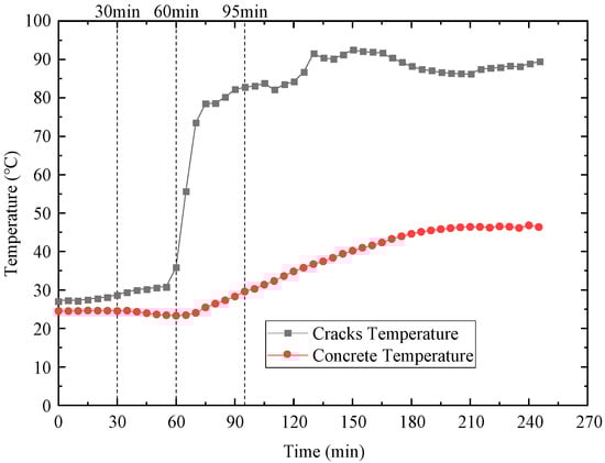 In the fire test, the outer surface temperature of the ceiling, including the concrete surface temperature, as well as the temperature of water and vapor discharging from concrete cracks, was recorded via infrared thermography. The infrared images revealed that the temperature at the concrete cracks was higher, owing to the high temperature of water and vapor overflowing from the cracks. Figure 14 presents a comparison between the temperature of water and vapor at the cracks obtained from infrared images and the temperature of the concrete surface measured by the thermocouple. At 30 min, the temperature of water and vapor at the concrete cracks gradually rose, while the concrete surface temperature of the ceiling resembled the ambient temperature. At 60 min, the temperature of water and vapor at the concrete cracks elevated rapidly, reaching 82.8 °C in a short period and being sustained at a high temperature thereafter. The temperature variations of the ceiling surface monitored by infrared thermography were consistent with the macroscopic test phenomena detected on the outer surface of the ceiling. Specifically, at 27 min, the volume of water discharging from the concrete cracks on the ceiling steadily increased, as shown in Figure 5a, and at 58 min, boiling water vapor started to overflow from the cracks on the ceiling, as illustrated in Figure 5d.