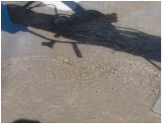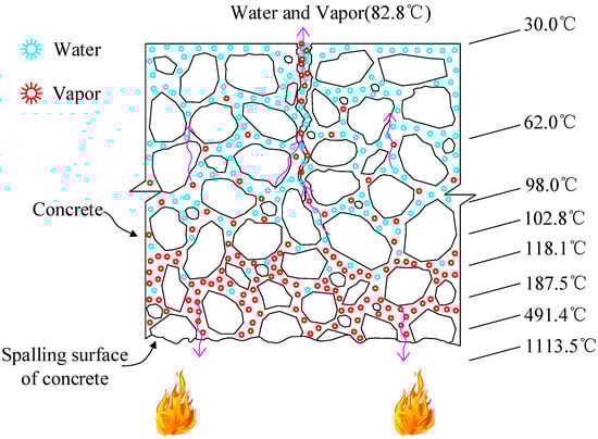 As discussed previously, the migration of moisture in concrete over a short period can be neglected. However, water and vapor that quickly overflowed on the outer surface of the ceiling migrated inside the concrete through cracks. During the migration of water and vapor from high-temperature to low-temperature areas, they were cooled. In the initial stage of the fire test, the temperature of the concrete was low, the internal cracks were small, and the vapor pressure inside the concrete was not high. As a result, the migration of water and water vapor to the low-temperature area was relatively slow. A small amount of water vapor was rapidly cooled by concrete and condensed into liquid water. Consequently, only a small amount of liquid water overflowed from the concrete cracks, and the temperature did not increase significantly. Figure 5 and Figure 12 show the water overflow on the ceiling surface and the infrared image of the ceiling, respectively. With the progression of the fire test, the concrete temperature gradually increased. Under the influence of high temperatures, the moisture in the concrete vaporized rapidly, and the pressure inside the concrete increased rapidly. High-pressure vapor inside the concrete was released through cracks. At the time, the internal cracks in the concrete were relatively large, and the vapor pressure could propel the water and vapor in the concrete to quickly migrate to the low-temperature area through the cracks. Water and water vapor lost less heat during their rapid migration to the low-temperature area. Therefore, a significant amount of high-temperature water and vapor overflowed from the concrete cracks at the stage, as shown in Figure 15. At 95 min, boiling water and vapor overflowed from the concrete cracks, but the temperature monitored by infrared was 85.7 °C because the high-temperature water vapor was cooled by low-temperature water and concrete during its migration to the low-temperature area.