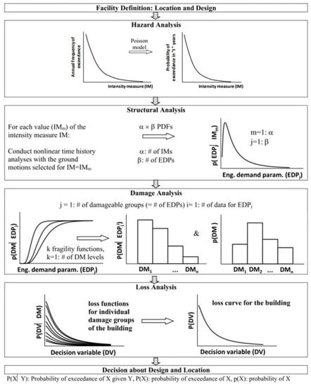 The traditional philosophy of seismic design of structures is bounded by two primary variables: earthquake intensity and corresponding damage for structural and non-structural elements. The acceptance criteria are: preventing any damage in low-intensity earthquakes; accepting only repairable damage in medium-intensity earthquakes; and preventing collapse in high-intensity earthquakes. The structural engineering community recognized many deficits in this methodology after the 1994 Northridge and 1995 Kobe earthquakes. Although structures were designed according to seismic codes inherited from this philosophy, the reported total damage and economic losses were extremely high []. The deterministic methodology describes the structural design only in binary terms, as either safe or unsafe. Additionally, it depends only on meaningful parameters for engineers, not other stakeholders. These facts initiated the concept of performance-based earthquake engineering (PBEE).