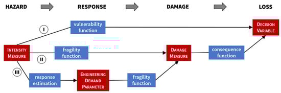 - The first path is the most rapid and straightforward calculation approach, skipping the structural and damage analysis steps. It consists of a single direct step from IM to DVs using vulnerability functions. These functions are calibrated using ground motion intensity maps, and insurance claims data from past earthquakes. This approach may be efficient for limited asset types, i.e., single-family timber houses;
