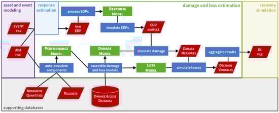 As explained in Figure 6, the software architecture has a flexible design that allows for all three paths []. Moreover, it considers minimizing computational resources and future scalability. The source code is written in Python to provide cross-platform usability, meaning that it works on Windows, Macintosh, and Unix operating systems. Furthermore, this will facilitate its usability in high-performance computing (HPC) cluster environments without requiring administrator support, compilation, or the installation of dependencies. Workflow inputs are the Asset Information Model (AIM) and EVENT files; both should follow a standard JSON format. Structure-response simulations are out of PELICUN’s scope, so this model integrates an exterior application to the framework, such as OpenSees []. The process of integration requires only developing interface classes for parsing data formats. The architecture includes four main models, and their objectives are shown in Figure 7 and determined as follows []: