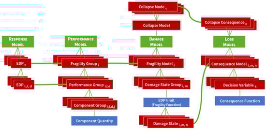 - The performance model organizes the asset components (structural, non-structural, and contents) in a descriptive hierarchy for damage analysis based on the FEMA P58 method []. The hierarchy consists of three layers: