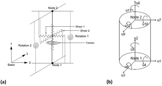 Traditional finite-element model for a bearing element: (a) model components; and (b) degrees of freedom [].