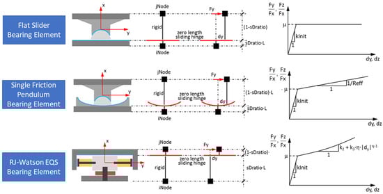 In Opensees [] an encapsulated element command, flatSliderBearing, was developed for this type of isolator. It considers the primary bearing element, shown in Figure 8. Shear springs are assigned to an elastic-perfectly plastic uniaxial material, whose behavior is a function of the elastic slope (Kinit) and an assigned friction model. Specifically, the sDratio is determined by the position of the slider interface. The single friction pendulum (FP) and the RJ-Watson EQS bearing elements are evolving forms of the flat slider element, as their behavior has a linear increase in the force capacity through the plastic zone. The restoring force capability in the single FP element results from exposing the slider to a spherical concave dish. The second-slope stiffness (Kd) is estimated according to Equation (5), where R is the radius of curvature of the spherical concave dish: