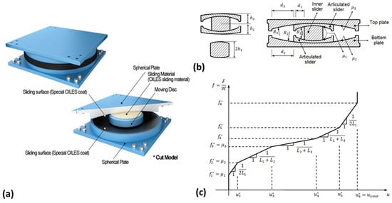 where W is the weight carried by the bearing isolator, and μ represents the friction coefficient of the sliding interface. Isolators should have a low value of μ to permit in-plane displacements and achieve flexible behavior. According to the manufacturers’ reports, the practical value could range from 0.03 to 0.2. The slider is usually manufactured from ductile iron bonded with polytetrafluorethylene (PTFE) material. Figure 9 shows different friction-based slider-bearing devices and their nonlinear shear behavior. The friction effect can be simulated numerically on OpenSees [] through friction models: (Coulomb), (velocity dependent), (velocity and normal force dependent), (velocity and pressure dependent), and (multi-linear velocity dependent). The flat slider bearing element is the simplest device with a flat steel-bearing plate and a slider that is allowed to move horizontally. This model leads to elastic–perfectly plastic behavior in the shear force and displacement relationship.