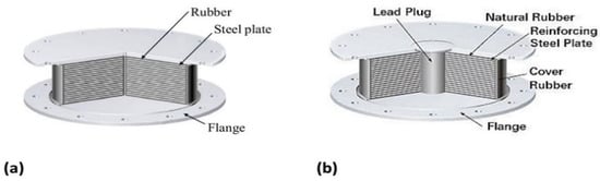 View of elastomeric bearings: (a) low-damping or high-damping rubber bearing; and (b) lead-rubber bearing [].