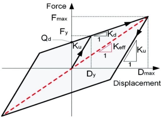 According to [,], designing elastomeric bearings with a high shape factor provides some benefits, such as mitigating rocking motion and enhancing stability. Most guidelines recommend designing elastomeric bearings with shape factors from 15 to 25 [] or 30 []. However, Equation (12) demonstrates that the vertical stiffness would be thousands of times greater than horizontal stiffness for these high shape factors. Additionally, the actual value is potentially more, as rubber compressibility is neglected. This design procedure could be effective in horizontal isolation, but it causes vertical isolation periods ranging from 0.03 to 0.15 s and significant amplification of the vertical acceleration. Lead–rubber bearings are an enhancement of low-damping natural rubber bearings by adding a lead plug in the central hole of the bearing, refer to Figure 11. This plug deforms plastically under shear deformation, which increases the energy dissipation capabilities. The resulting horizontal force–deformation relationship of a lead–rubber bearing is defined using bilinear behavior, as shown in Figure 12.