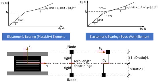 OpenSees [] numerically includes various commands developed specifically for elastomeric bearings. As shown in Figure 13, the elastomericBearingPlasticity and elastomericBearingBoucWen elements adopt the traditional bearings elements with customizing shear components, where is determined according to following equation:
