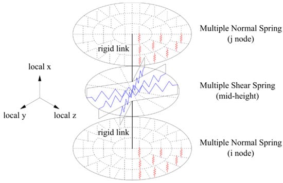 where , are, respectively, the post-yield stiffness ratio of linear and nonlinear hardening, is the initial stiffness, dy is the displacement, and μ is the exponent of nonlinear hardening. The elastomericBearingPlasticity element requires defining and the associated parameters with to simulate horizontal isolation. However, the elastomericBearingBoucWen requires additional parameters to predict the hysteretic energy dissipation precisely, and they are typically the yielding exponent (sharpness of hysteresis loop corners, η), first hysteretic shape parameter (β), and second hysteretic shape parameter (γ). Furthermore, the elastomericX, LeadRubberX, and HDR elements are developed for modeling circular low-damping rubber, lead–rubber, and high-damping rubber isolators, respectively. These commands might be more accessible as no predefined materials are required. Instead, modeling requires geometric properties, e.g., internal diameter, outer diameter, the number and thickness of steel or rubber layers, and material properties, such as shear modulus, bulk modulus, and yield strength. These commands were developed by [] to provide an automation procedure for generating mechanical properties with a broad verification investigation. For general modeling purposes of square or circular shapes, the KikuchiBearing element, which was developed by [], provides an elastomeric bearing element. It consists of multiple shear spring (MSS) and multiple normal spring (MNS) models, as shown in Figure 14. The required parameters are the assigned material, the total number of shear and normal springs, and the geometric parameters, e.g., the cross-section, total rubber thickness, and the total height.