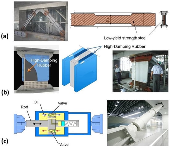 Types of response control dampers: (a) steel hysteretic damper using low-yield-strength steel; (b) viscoelastic damper using high-damping rubber; and (c) viscous fluid damper [].