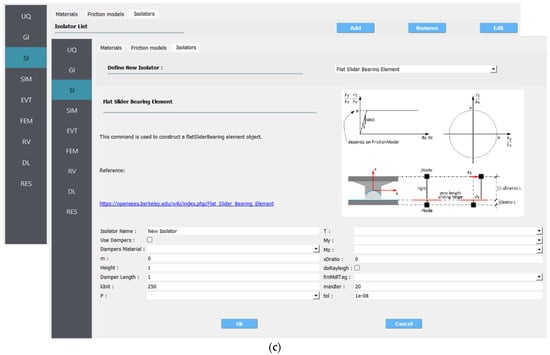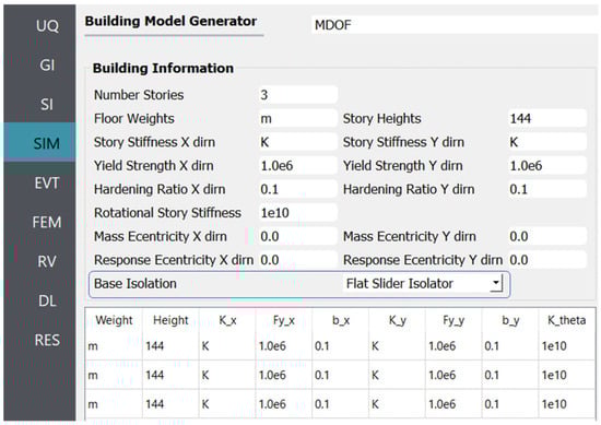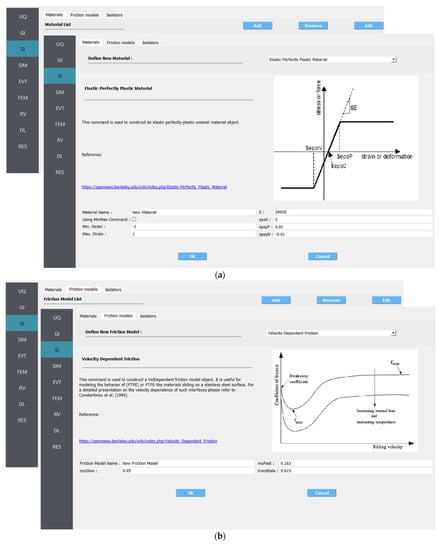 This research proposes extending the NHERI-SimCenter application framework to implement seismic isolation (SI) modeling rather than incremental dynamic analysis (IDA). The NHERI-SimCenter EE-UQ tool provides the capability to perform simulations and estimate the EDPs of multi-degree-of-freedom (MDOF) system structures, considering input uncertainties. Moreover, the PBE tool completes these steps with damage and loss measures. Some effort was required in the frontend and backend components to integrate previously mentioned isolator models with these tools. Figure 16 shows the added panel in the user interface to model multiple isolation systems. Since some SI models require predefined objects of materials or friction models, it is divided into three tabs. The user can define a list of materials and friction models (if needed) and assign their elements as properties for an isolator object. Combining dampers with the bearing elements is a valid option, rather than assigning their axial materials. This interface contains wrappers for all previously discussed bearing elements, all friction models in Opensees [], damping materials, i.e., viscous, and ViscousDamper, and general behavior uniaxial materials, i.e., elastic, elastic–perfectly plastic, and hysteretic.