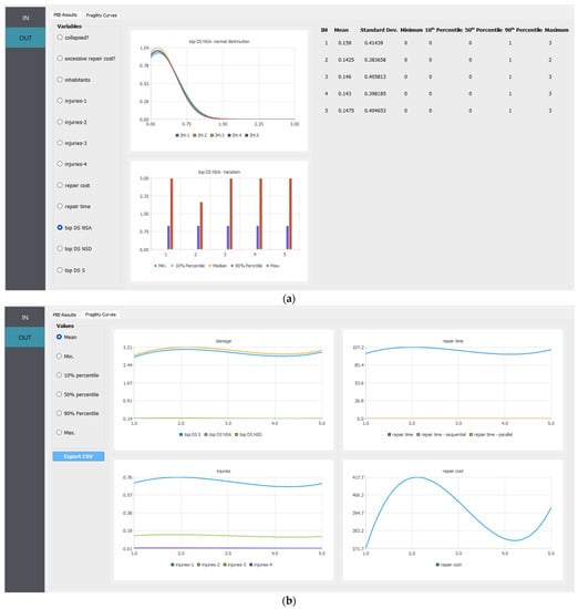 On the other hand, a new application with a simple user interface has been developed for IDA. It is designed to access and execute PBE classes in the background. The user should determine a PBE file and required IMs increments. Then, the program creates multiple copies of this file and scales the record motions each time. Referring to Figure 18, the outputs are presented in two taps: presenting the decision variables’ probabilities at each incremental step and showing them as a function in different IMs.